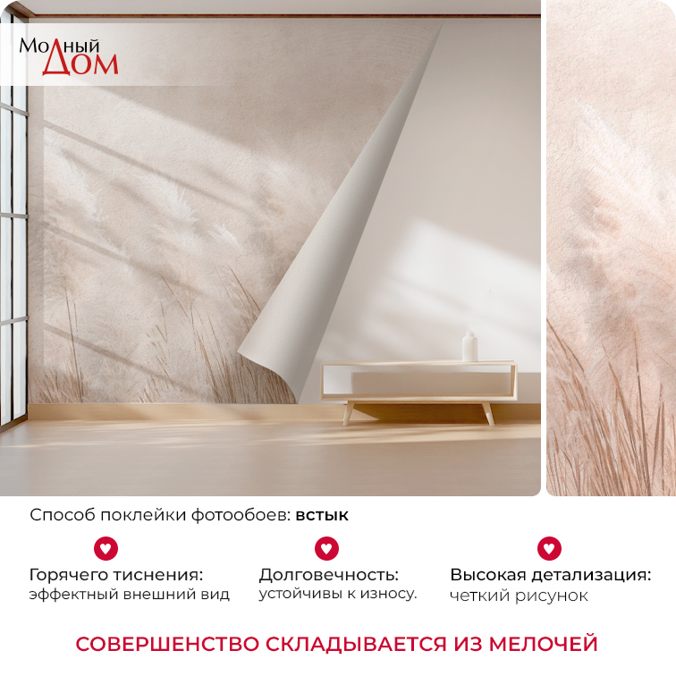 ЧЕМ ОТЛИЧАЕТСЯ фотообои МОДНЫЙ ДОМ ОТ ФОТООБОЕВ И ФРЕСОК ДРУГИХ КОМПАНИЙ?05Вы можете разместить фотообои в любом месте стены. фотообои Модный Дом легко продолжить оклейкой обоев такой же основы. Нет необходимости обрамлять границу фотообои или клеить от угла до угла комнаты.