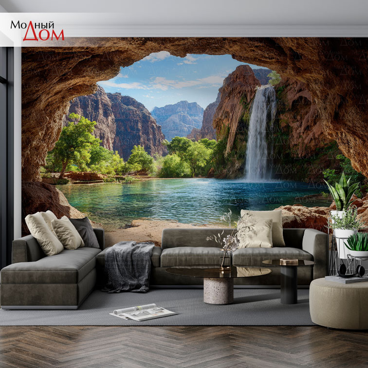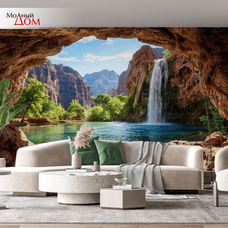 Обойное полотно Фотообои «Модный Дом», Вид из пещеры на водопад 02-124 в виде живописных фотообоев – это отделочный материал, который способен украсить любое помещение. Их можно без труда вписать в любой из существующих интерьерных стилей.
