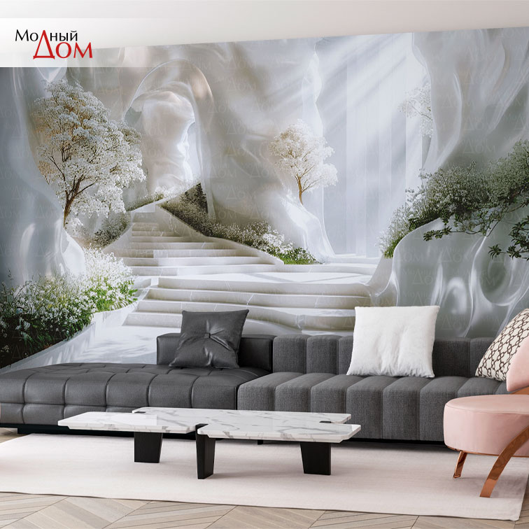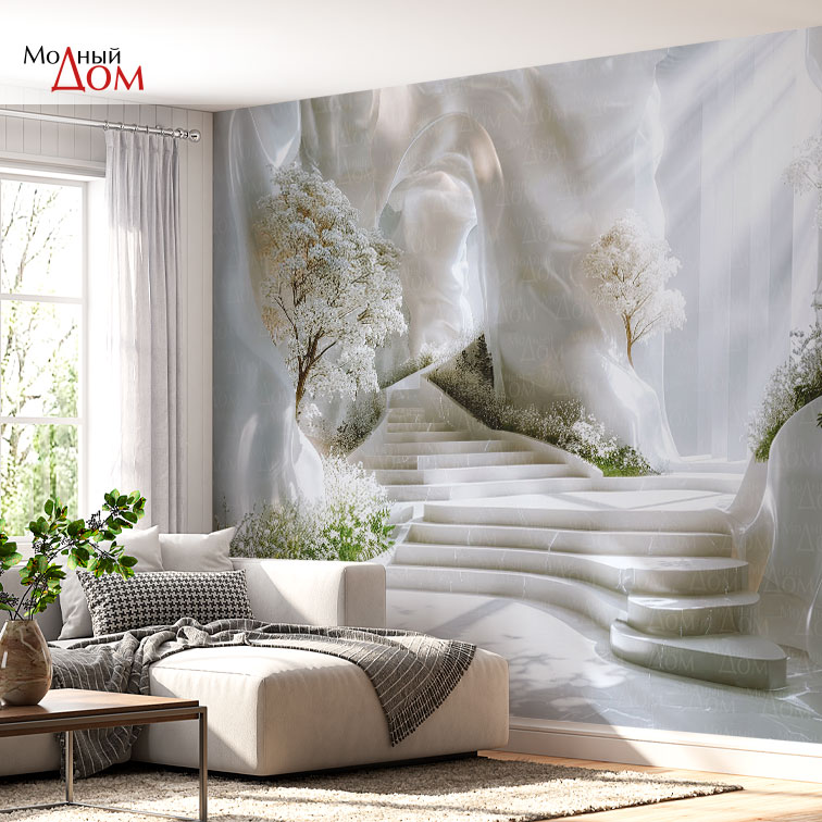 Обойное полотно Фотообои «Модный Дом», Деревья у мраморной лестницы 02-130 в виде живописных фотообоев – это отделочный материал, который способен украсить любое помещение. Их можно без труда вписать в любой из существующих интерьерных стилей.